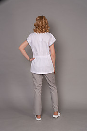 Прилегающая блуза, без воротника, с частичной застежкой. Застежка на груди в виде "щели" с застежкой на паты с кнопками. Рукав цельный спущенный. Горловина, край рукава, верхний край кармана обработаны кантом 0,5см. Карманы накладные расположены спереди, ниже линии талии, застегиваются на пату с кнопкой. Сзади на линии талии внудрення кулиска, с регулируемой резинкой. ткань "сатори" 145г/м.
