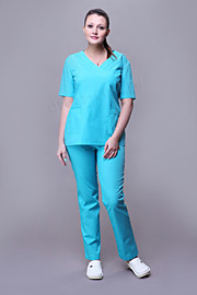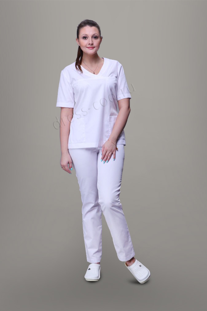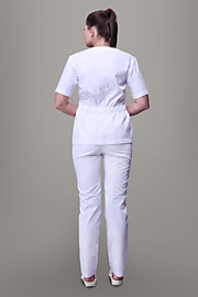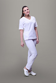 Блуза прилегающего силуэта "хирургия". без воротника, без застежки. Рукав втачной, короткий. Сперди накладные карманы ниже линии талии. Сзади на талии внудренняя кулиска с регулируемой резинкой.