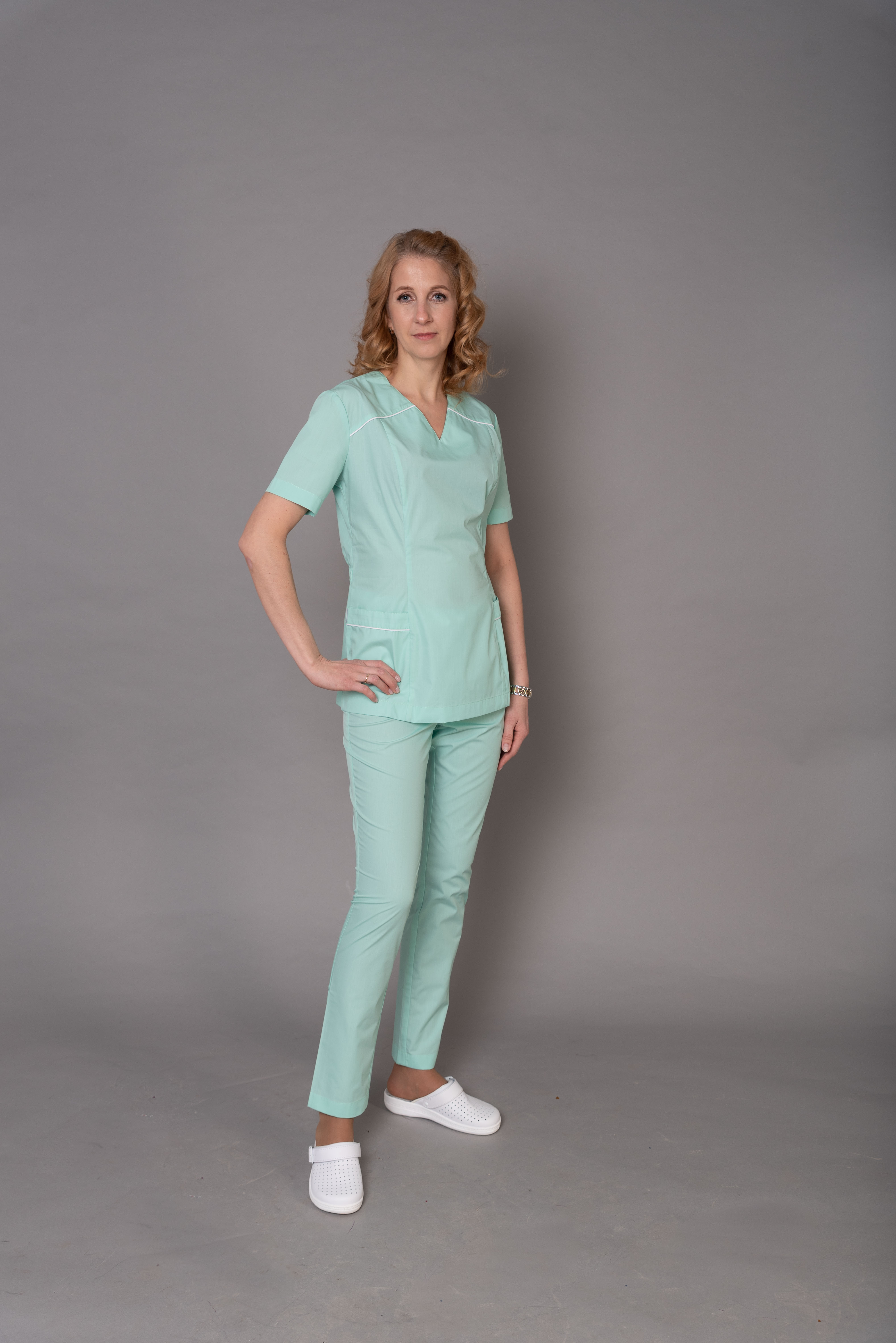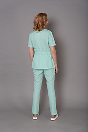 Прилегающий силуэт. без воротника, без застежки. Хирургия. Спереди на плеча фигурные кокетки. Вертикальные выточки от низа до груди. Спереди накладные карманы ниже линии талии. Сзади на талии внутрення регулируемая резинка. Рукав втачной. короткий.