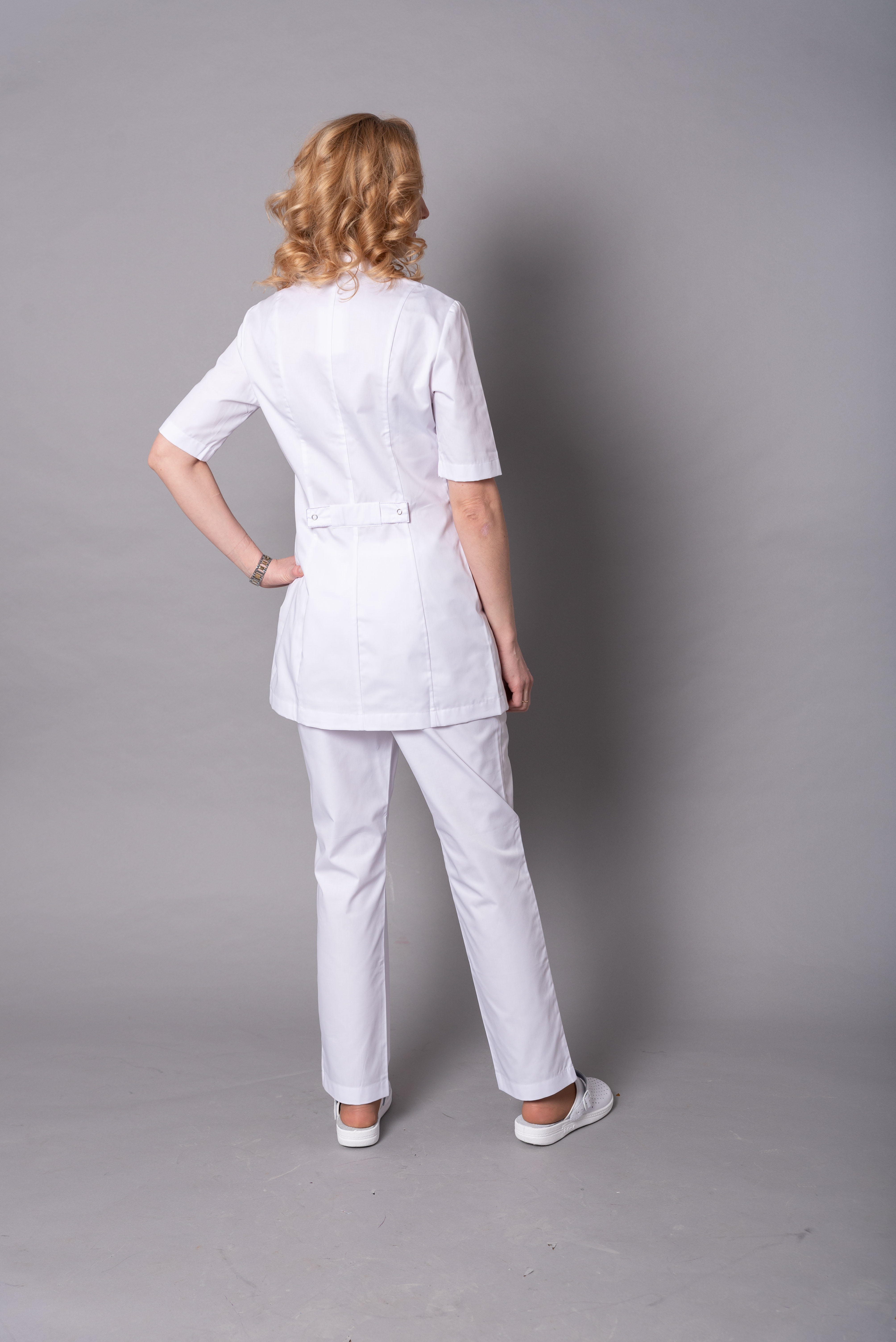 Блуза приталенная, с V-образным вырезом и воротником стойкой. Застежка на кнопки. Фасонные линии вертикальные из плеча спереди и сзади. Рукав втачной, короткий. Сзади на талии регулируемы хлястик.
