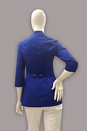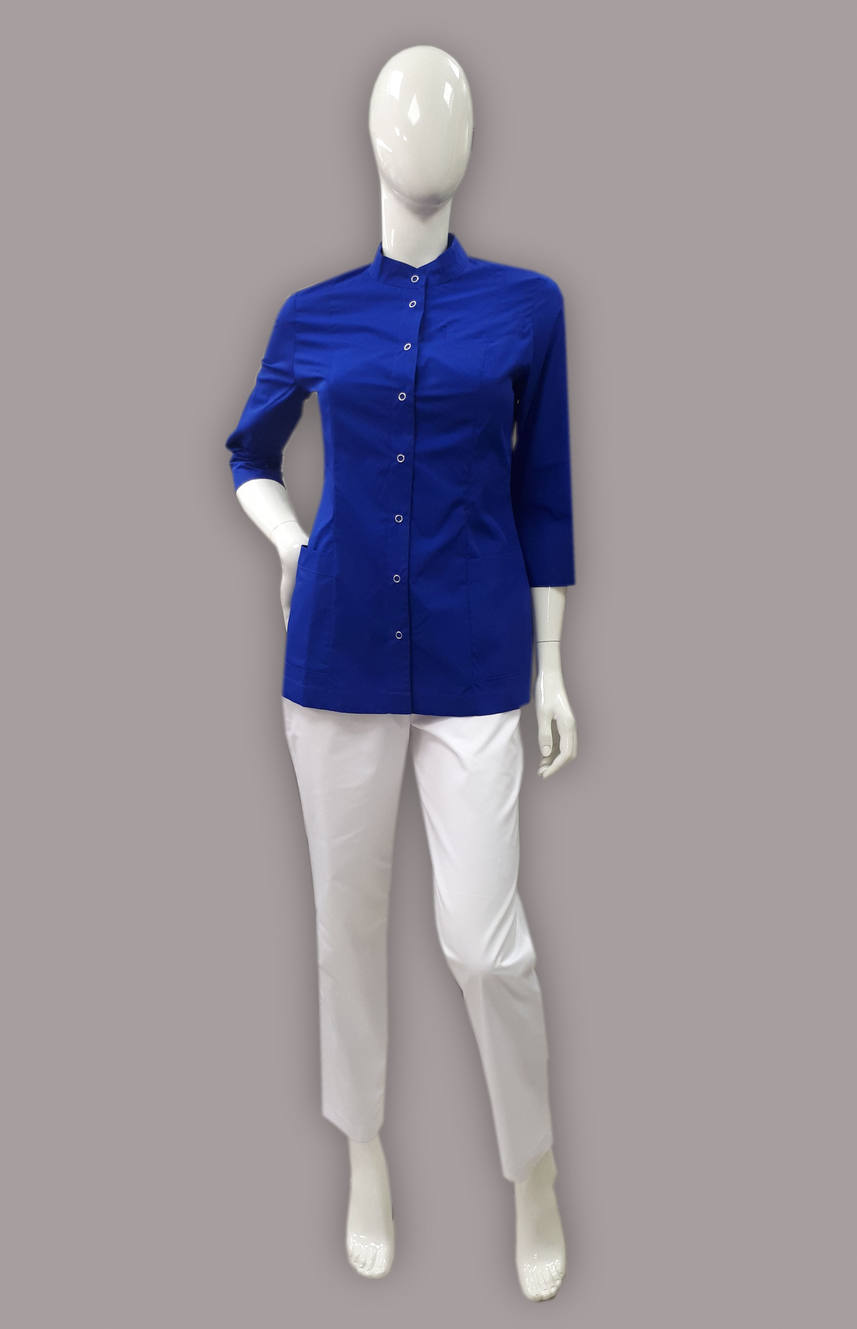 Блуза приталенная, с воротником-стойка, застежка - планка с кнопками. Фасонные линии вертикально проходят сперди и сзади из плечевых швов. Карманы расположены один на груди, два ниже линии талии между фасонными и боковыми швами. Ркав втачной, 3/4 с отворотом. Сзади на талии пояс регулируемы кнопками. Ткань сатори-лайт 115г/м.