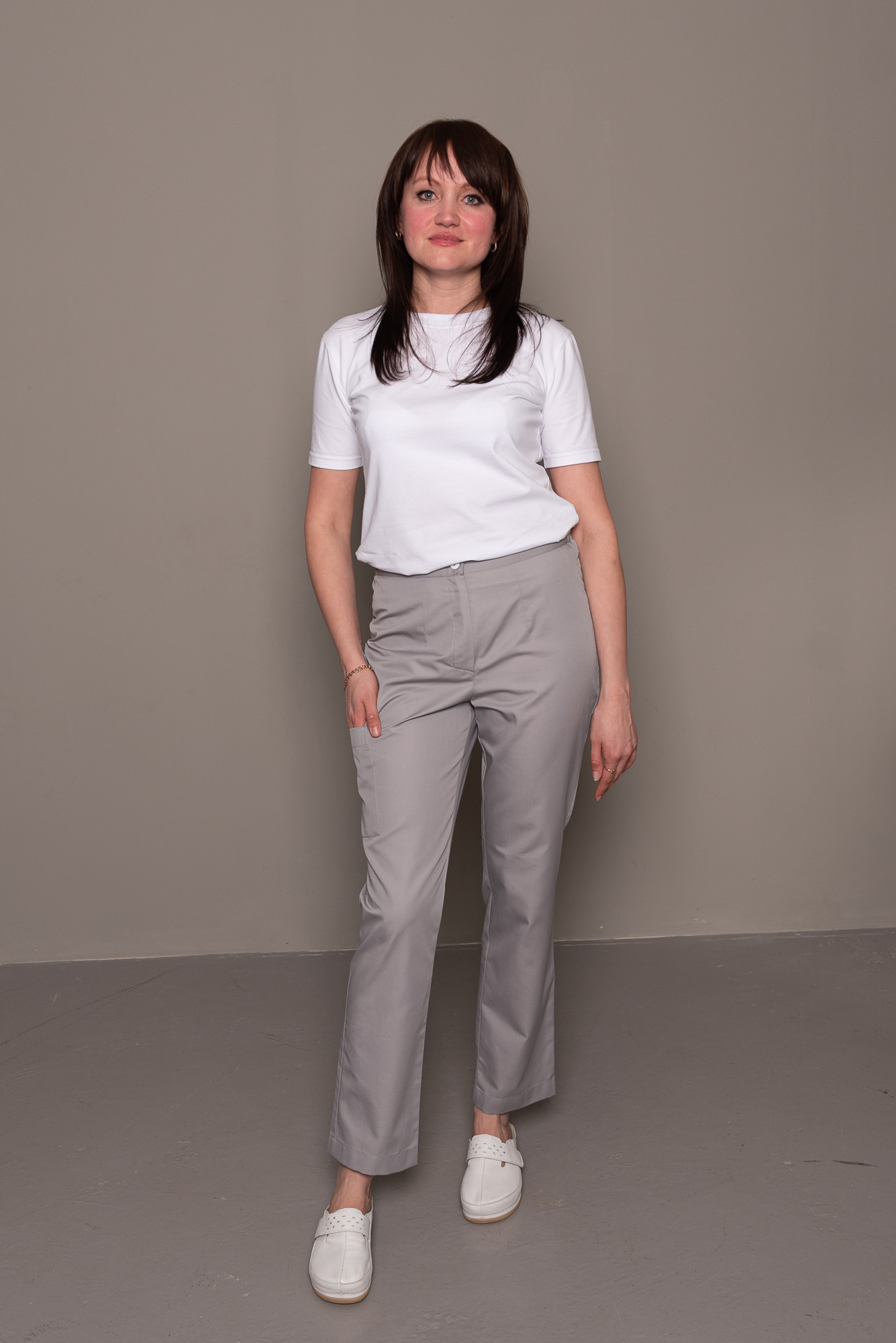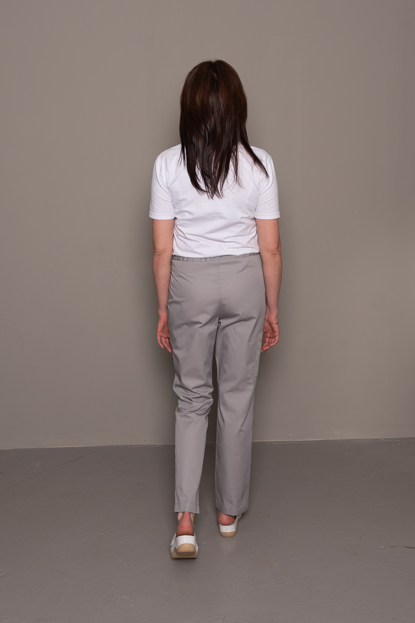 Брюки зауженные. Пояс спреди с застежкой-гульфиком на молнию, сзади с регулируемой резинкой. Справа на бедре по центру бокового шва расположен накладной карман. Ткань "сатори" 145г/м.
